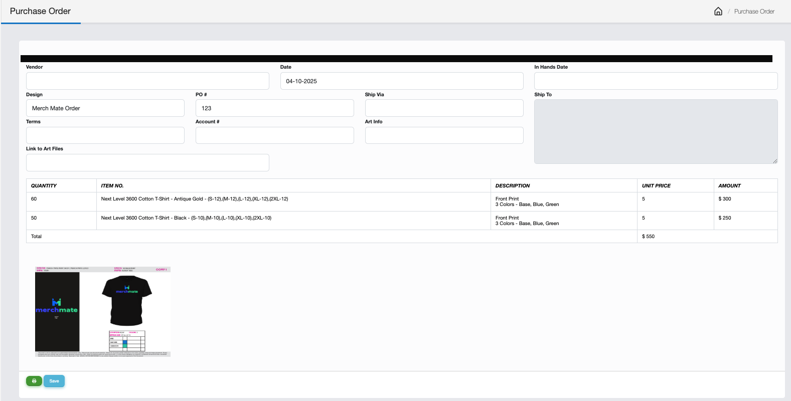 Create a purchase order from scratch or convert an approved quote to a purchase order and email it to your vendor directly from Merch Mate!
