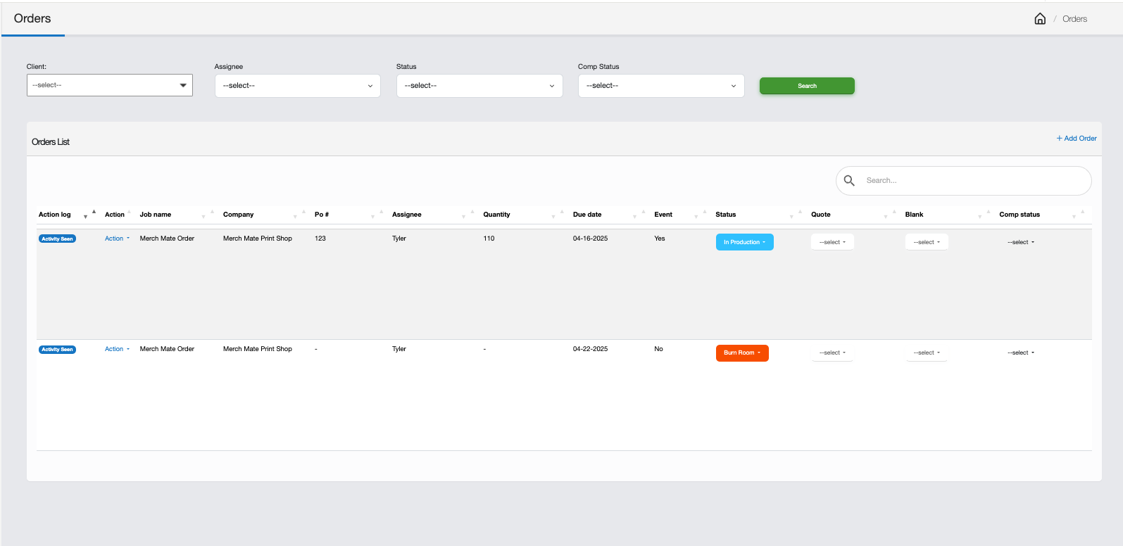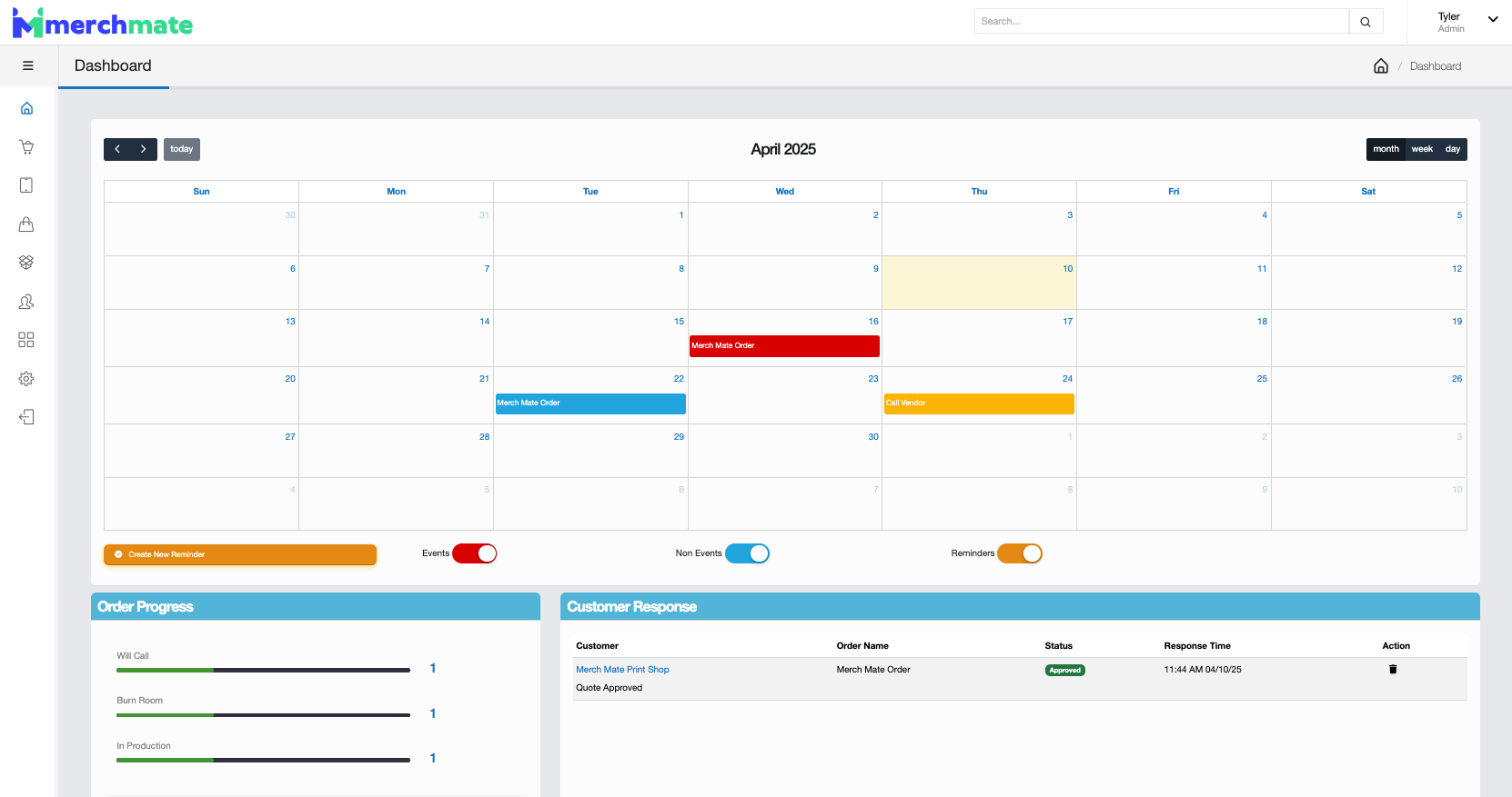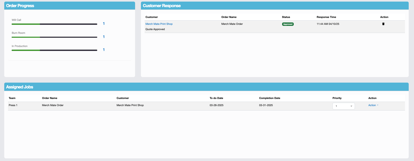 Merch Mate helps screen printers, embroidery shops, and resellers quote faster, track orders, and keep customers in the loop!