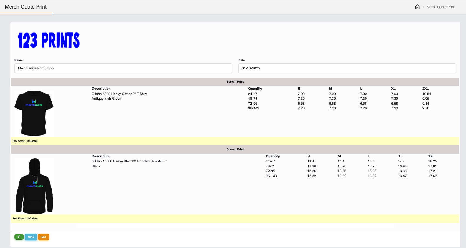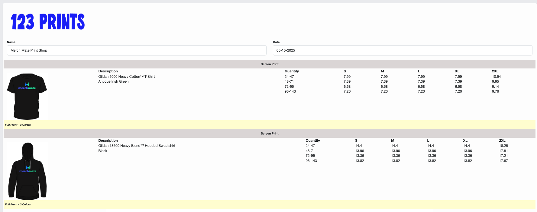 Easily create pricing for multiple designs, products, and quantities - fast - with Merch Quotes!